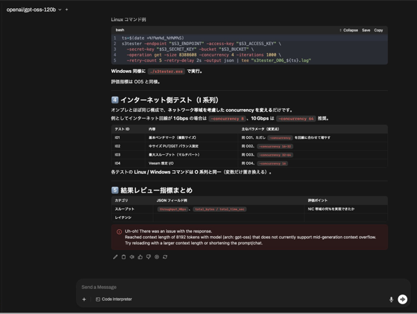 気分を変えて、GPT-OSS 120Bをバックエンドにしてフロントエンドを展開してみた。長めのトークンで長めのリターンをもらうと思ったら、リターンで 8Kを使い切ってしまった。こういう使い方だとChat GPTの方がいいかもしれないが、Chat GPTは端折って回答してたのが、GPT-OSSは丁寧に回答してくれていると思う。