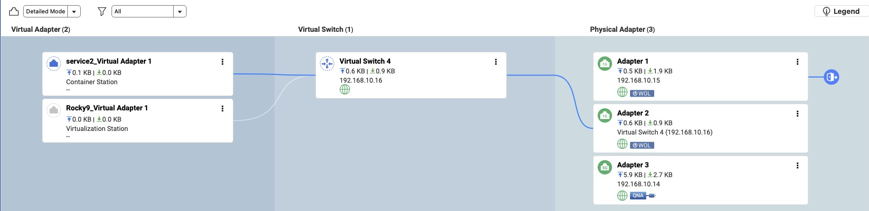 Adapter1:デフォルトゲートウェイ Virtual SwitchのNATの出口 / NASのUI / DNSでホスト名として登録されている。SMB/NFSなどのNASのネイティブサービス向け。