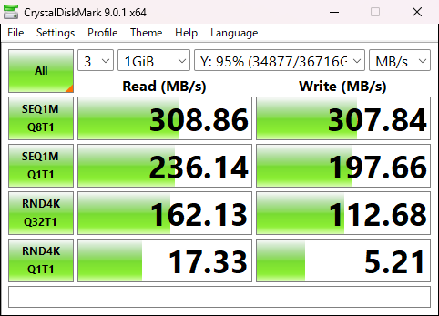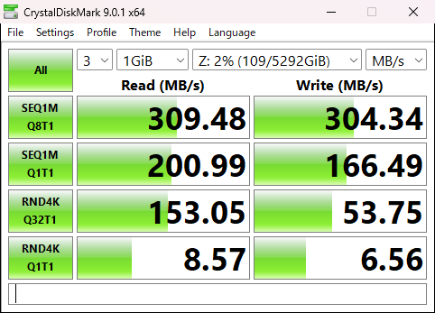 テストクライアントは、Minisforum NAB6 (Intel12世代Core i7 64GB RAM Windows 11)で2NICがついているが1本しか刺していない。SMB Multichannelはトラブルが多いので使わない。MTU9000でも難儀したのでこれ以上問題を増やしたくないし。