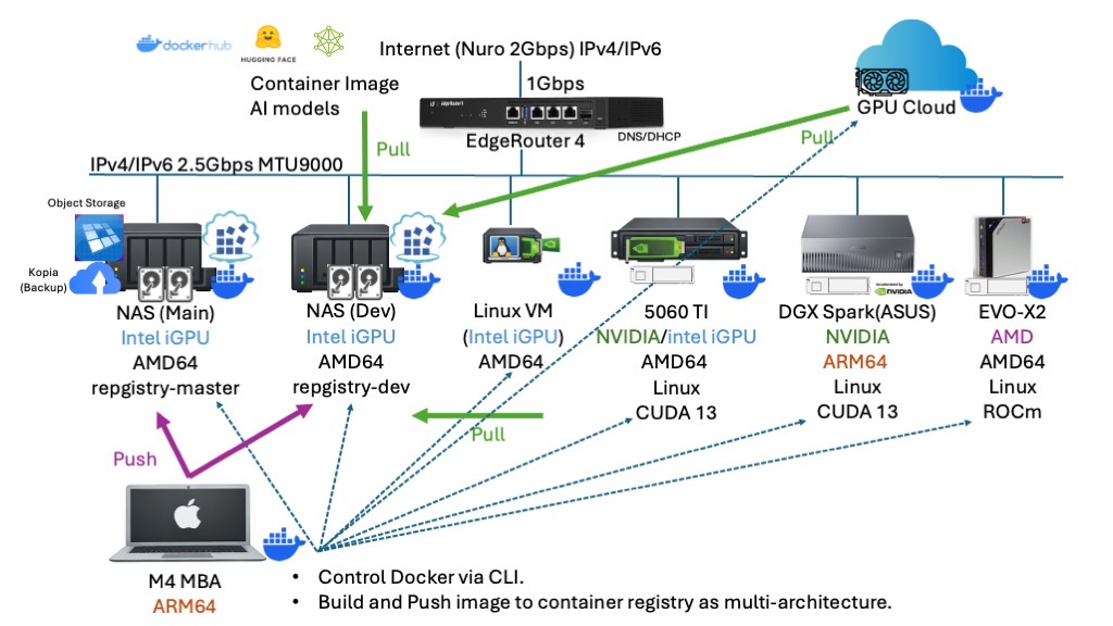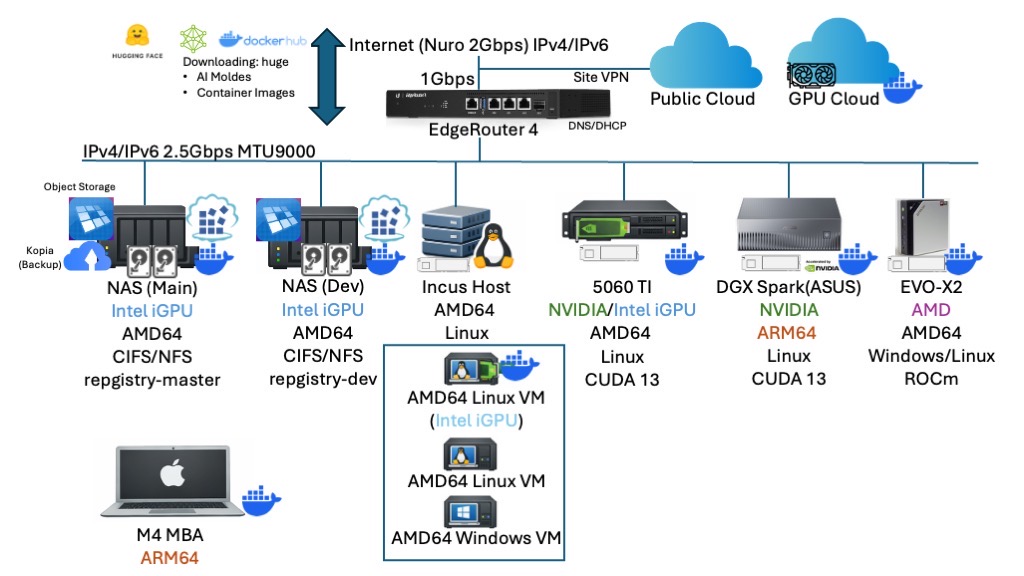 - AIモデルは、NASからHugging Faceにダウンロードして後で配布。(モデルのツリーを作って保存して、Rsyncで同期)Ollamaなどのフレームワークも同じ