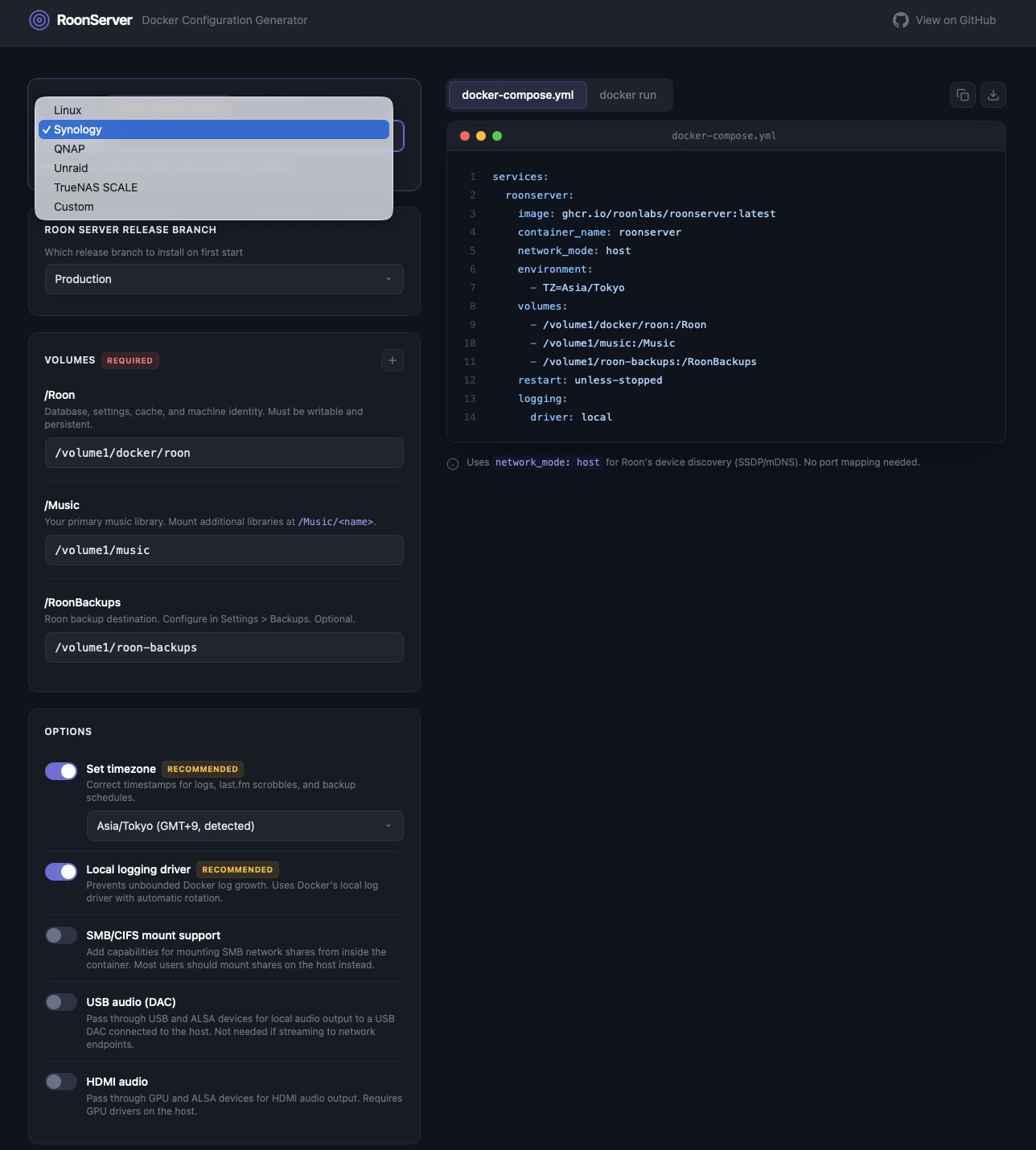 Githubのコメントを見ると、デフォルトはあえてSynologyにした様子。やはりユーザが一番多いのか?ここに記載されていないNASやNUCは、Linuxを選べばいいと思う。NASのDockerは、ベンダーそれぞれ、永続的なデータをおけるパスが異なるので親切に記載したらしい。